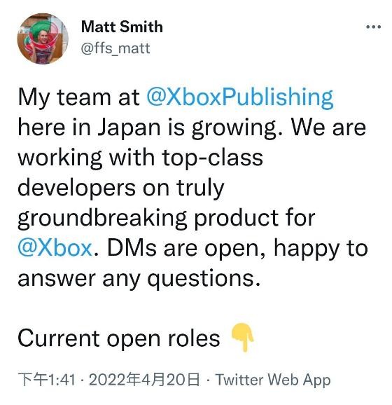 微軟 Xbox 發(fā)行主管 Matt Smith 近日在推特稱(chēng),其日本工作團隊正在和頂級開(kāi)發(fā)商合作,但沒(méi)有透露具體是哪個(gè)。