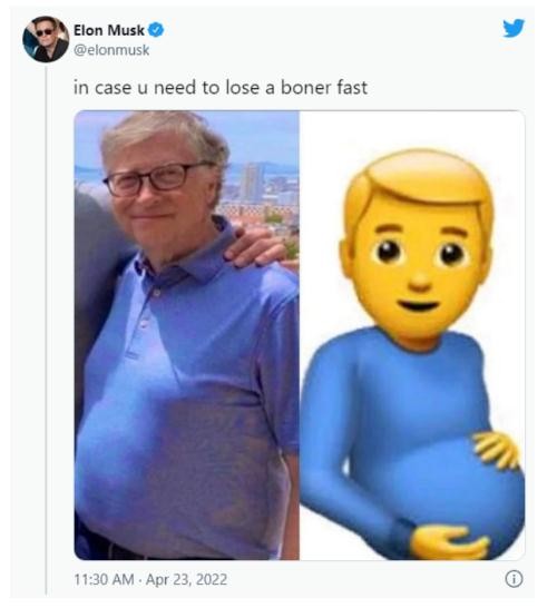 馬斯克隨后在推特上確認了聊天內容的真實(shí)性,還在周五發(fā)布了一組表情包,將蓋茨照片和一個(gè)男孕婦的表情放在一起,似乎在嘲笑蓋茨的體重。