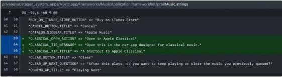 但是在 Music 應用代碼中有“打開(kāi)蘋(píng)果古典音樂(lè )”和“打開(kāi)這個(gè)專(zhuān)為古典音樂(lè )設計的新應用”,這表明在不久的將來(lái)它還是會(huì )出現。