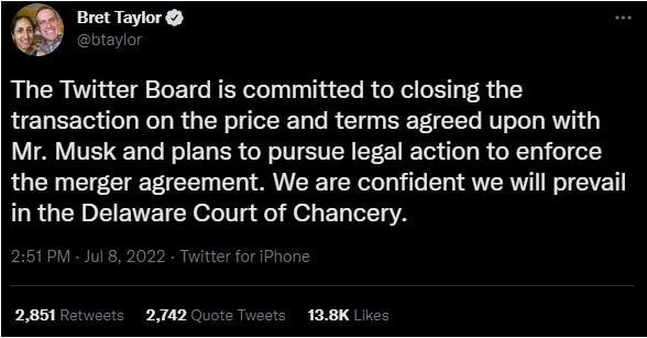 可如果馬斯克堅持咬定 Twitter 未遵守協(xié)議,根據 Twitter 董事會(huì )成員 Bret Taylor 的推文,公司將以違反合同為由將馬斯克起訴到特拉華州商事法院,Taylor 表示公司致力于按照達成的協(xié)議價(jià)格和條款完成交易。