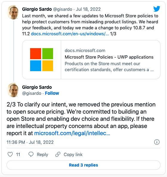 在原本的生效日期(7 月 16 日)后兩天,Giorgio Sardo 在推特上再次出面表示,已經(jīng)對應用商店政策做了優(yōu)化,即刪除了第 10.8.7 節中提到的開(kāi)放源代碼定價(jià)條款,同時(shí),為了強調微軟的實(shí)際意圖,在第 11.2 節中添加了指向微軟在線(xiàn)侵權報告表的鏈接。“我們致力于建立一個(gè)開(kāi)放的商店,讓開(kāi)發(fā)者有足夠的選擇和靈活性。微軟商店里有很多很棒的免費和付費 OSS 應用,我們期待并歡迎更多項目加入。”