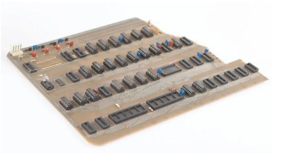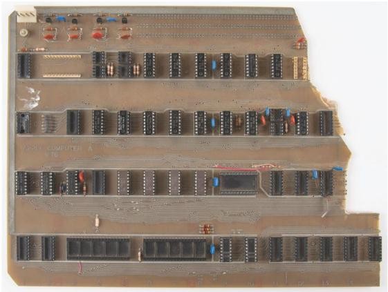 這塊在 1976 年由史蒂夫-沃茲尼亞克手工焊接的 Apple Computer A 印刷電路板被史蒂夫-喬布斯用來(lái)向保羅-特雷爾演示 Apple-1 電腦,后者是加州山景城 The Byte Shop 的老板。特雷爾之后訂購了 50 臺完全組裝好的機器并以每臺 666.66 美元(約 4506.62 元人民幣)的價(jià)格出售,The Byte Shop 成為了 Apple-1 電腦的第一個(gè)零售商。
