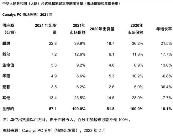 2021 年各品牌在中國市場(chǎng) PC 產(chǎn)品出貨量 圖源:Canalys