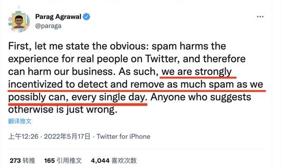 此外,推特還將增加用戶(hù)數量的任務(wù)置于減少虛假賬戶(hù)數量之上,并用高達 1000 萬(wàn)美元的獎金激勵高管增加用戶(hù)數量。而此前 5 月,推特 CEO Parag Agrawal 信誓旦旦地表示,“公司有強烈的意愿刪除盡可能多的虛假賬戶(hù)”。