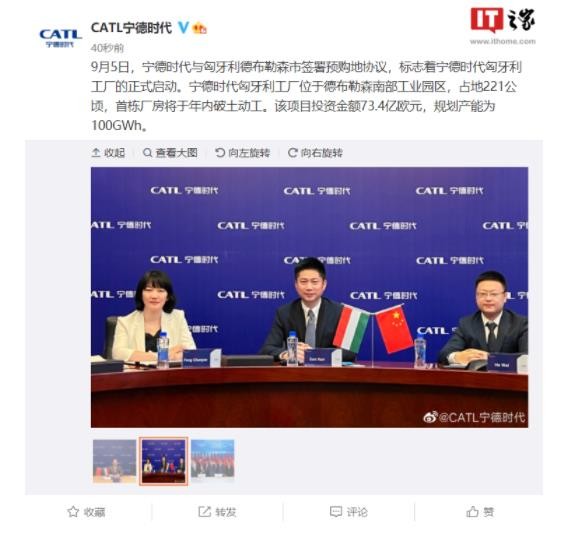 據寧德時(shí)代官方宣布,9 月 5 日,寧德時(shí)代與匈牙利德布勒森市簽署預購地協(xié)議,標志著(zhù)寧德時(shí)代匈牙利工廠(chǎng)的正式啟動(dòng)。