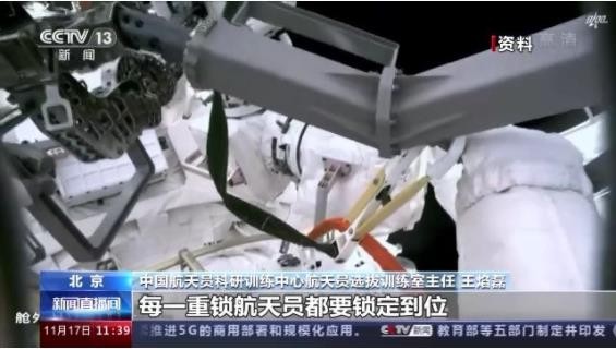 中國航天員科研訓練中心航天員選拔訓練室主任王焰磊:我們在兩個(gè)艙間連接裝置這個(gè)作業(yè)點(diǎn),本身設計了機械臂上航天員的不同的作業(yè)位置,它的復雜度以及操作的精細度是要更高的。舉一個(gè)例子,我們艙間連接裝置的其中一個(gè)固定點(diǎn)就有三重鎖,每一重鎖航天員都要鎖定到位,而且它是有相互關(guān)聯(lián)關(guān)系的,就要航天員的操作精細度要更高一些,而且是要保證我們連接裝置兩端連接緊固,保證以后我們在航天員艙外自主轉移的過(guò)程中路徑是一個(gè)可靠的路徑。