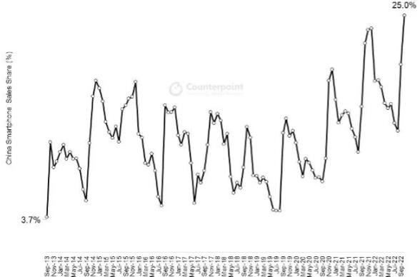 研究機構 Counterpoint 報告稱(chēng),2022 年 10 月,蘋(píng)果公司在中國的月度市場(chǎng)份額達 25% 為歷史最高水平,且連續兩個(gè)月成為中國第一大手機品牌廠(chǎng)商。