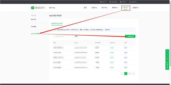2.進(jìn)入到支付平臺之后點(diǎn)擊橫向標簽的產(chǎn)品中心,然后再點(diǎn)左側標簽的APPID賬號管理,就會(huì )看到添加關(guān)聯(lián)公眾號或小程序的AppID按鈕了。