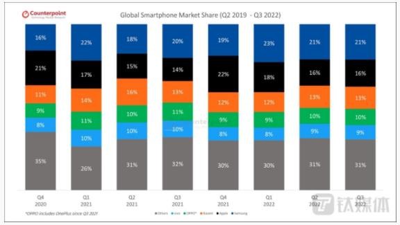 三星在 2022 年第三季度出貨量為 6400 萬(wàn)臺,同比下降了8%,市占率 21% 仍為全球第一。