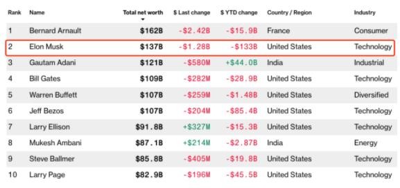 彭博億萬(wàn)富翁指數顯示,最近幾周特斯拉股價(jià)的暴跌,包括周二下跌 11%,已經(jīng)導致 51 歲的馬斯克的財富暴跌至 1370 億美元。他的財富在 2021 年 11 月 4 日達到了 3400 億美元的峰值,并一直是世界上最富有的人,直到本月被奢侈品巨頭路易威登集團背后的法國大亨伯納德?阿爾諾 (Bernard Arnault) 超越。
