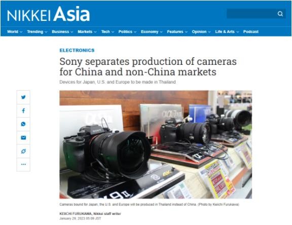 據日經(jīng)新聞報道,索尼集團已將在日本、美國和歐洲市場(chǎng)銷(xiāo)售的相機的生產(chǎn)從中國轉移到泰國,目的是通過(guò)減少對中國的依賴(lài)來(lái)保護其供應鏈。