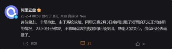 各位盤(pán)友,非常抱歉,由于系統故障,阿里云盤(pán) 2 月 3 日晚間出現了短暫的無(wú)法正常使用的情況,23:50 分已修復,不影響盤(pán)友的數據和后續使用。感謝大家關(guān)心,盤(pán)盤(pán)已經(jīng)去面壁了。