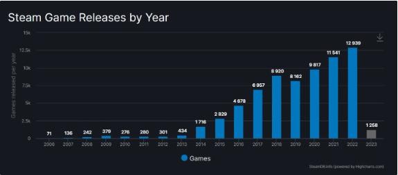 據 SteamDB 數據顯示,2022 年 Steam 一共上線(xiàn)了 12939 款游戲,超過(guò)了 2021 年的 11542 款游戲再創(chuàng )新高。其中推出新游最多的月份為 10 月 1260 款,最少的為 2 月 922 款,總體比較年底新游上線(xiàn)更為密集。