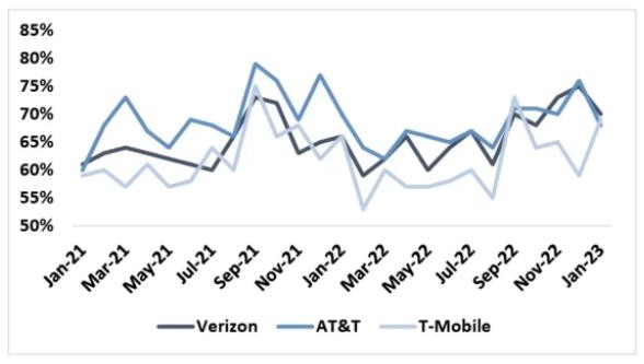 摩根大通在報告中指出:“iPhone 今年 1 月在美國三大運營(yíng)商(Verizon、AT&T 和 T-Mobile)中的銷(xiāo)售份額為 69%,去年 12 月為 70%。但表現比前代更優(yōu)秀,iPhone 13 周期中的占比為 67%;而 iPhone 12 周期中的占比為 60%”。