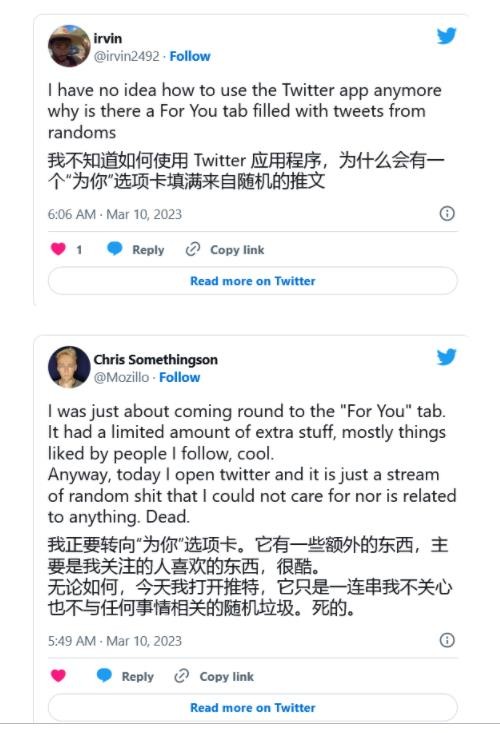更令用戶(hù)反感的是,“為你推薦”涌入的這些推文內容和當前用戶(hù)已關(guān)注賬號之間并沒(méi)有關(guān)聯(lián)性,完全不是用戶(hù)感興趣的內容。