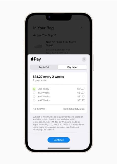 據介紹,用戶(hù)可以申請 50 美元至 1000 美元(IT之家備注:當前約 345~6890 元人民幣)的 Apple Pay Later 貸款,用于在 iPhone 和 iPad 上向接受 Apple Pay 付款的商家進(jìn)行在線(xiàn)購買(mǎi)和應用內購買(mǎi)??紤]到用戶(hù)的財務(wù)狀況,用戶(hù)可以在錢(qián)包中查看、管理和償還 Apple Pay Later 貸款。