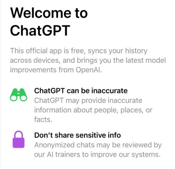 登錄后會(huì )出現歡迎界面,顯示 APP 是免費使用,可以和網(wǎng)頁(yè)端打通同步歷史。同時(shí)也提醒用戶(hù),ChatGPT 是有可能提供不準確的信息,并且建議用戶(hù)不要提供敏感信息,因為匿名信息也可能會(huì )被 OpenAI 的 AI 訓練員用來(lái)改善系統。