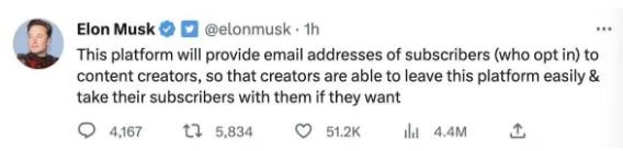 馬斯克發(fā)布推文稱(chēng) 推特將向內容創(chuàng )作者提供訂閱者的電子郵件地址 15:04:28