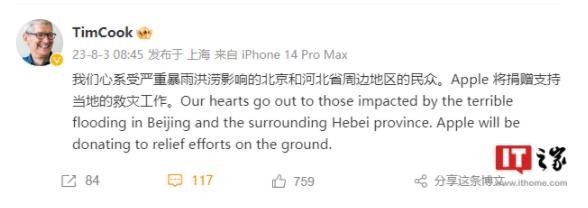 剛剛,蘋(píng)果公司 CEO 庫克在微博宣布:我們心系受?chē)乐乇┯旰闈秤绊懙谋本┖秃颖笔≈苓叺貐^的民眾。Apple 將捐贈支持當地的救災工作。