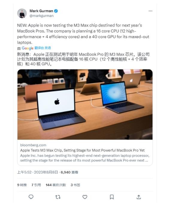 彭博社的馬克?古爾曼在今天發(fā)布的最新一期 Power On 時(shí)事通訊中,繼續爆料稱(chēng)蘋(píng)果目前正在測試 M3 Max 芯片,預估將于明年隨新款 MacBook Pro 和大家見(jiàn)面。
