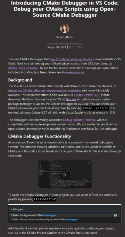 微軟日前宣布與 Kitware 合作,在 CMake 3.27 版本中合并 CMake 調試器,VS Code 目前已經(jīng)可以使用 CMake 調試器。
