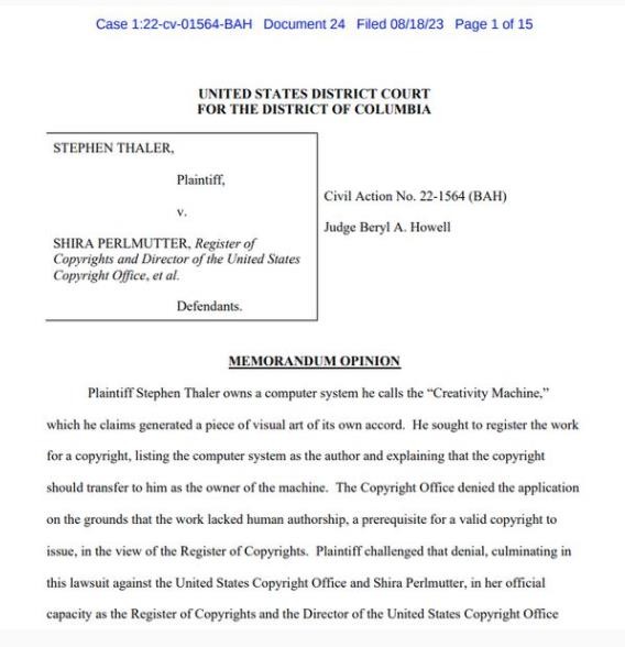 美國地區法官 Beryl Howell 上周五(8 月 18 日)表示,只有人工智能與人類(lèi)作者合作的作品才能獲得版權,并確認美國版權局駁回了計算機科學(xué)家 Stephen Thaler 代表其 DABUS 系統提出的申請。