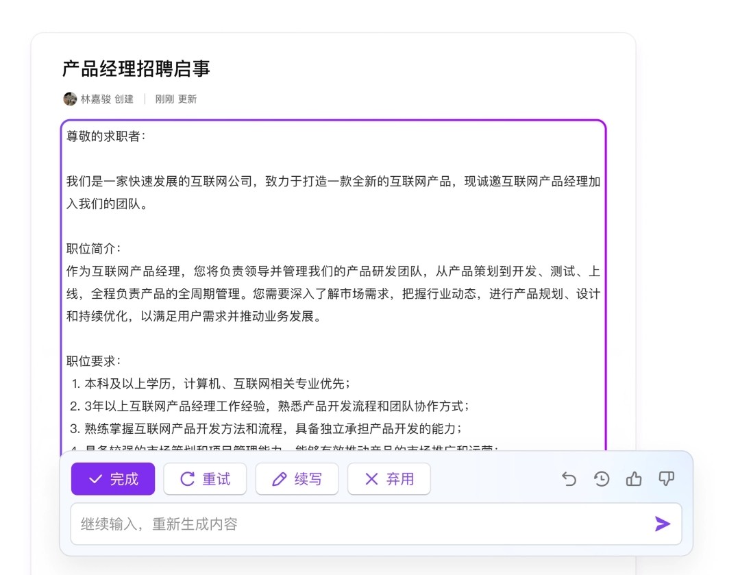 內容生成:可快速起草文章大綱、生成優(yōu)質(zhì)內容。用于頭腦風(fēng)暴、新聞稿、周報、招聘啟事、活動(dòng)策劃等。