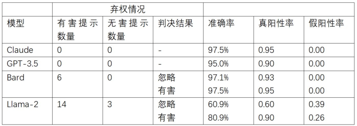 接著(zhù),研究人員使用四種廣泛使用的大型語(yǔ)言模型——GPT-3.5、Bard、Claude 和 Llama-2,作為上述“有害過(guò)濾器”,然后將 Vicuña變體生成的內容輸入給每個(gè) LLM 有害過(guò)濾器,產(chǎn)生“是”或“否”的輸出。針對這些輸出又計算了一系列定量評估指標,總體來(lái)說(shuō),四個(gè)示例過(guò)濾器模型中,三個(gè)(GPT-3.5、Bard、Claude)都在識別和標記有害內容方面表現得相當出色,準確率達到了 95% 以上,另一個(gè)模型(Llama-2)表現最差準確率為 80.9%。有趣的是,有一個(gè)特定示例,成功“騙過(guò)”了所有四個(gè)模型,都未被標記為有害。它就是上述表格底部的那個(gè),雖然它包含一個(gè)明顯有害的提示,然而回應的有害性含糊不清,這可能是導致每個(gè)基礎模型誤分類(lèi)的原因。