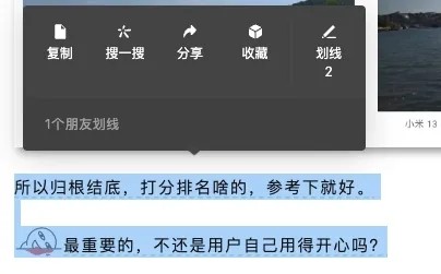 在使用微信瀏覽公眾號文章時(shí),可以選中某段文字,點(diǎn)擊右鍵進(jìn)行劃線(xiàn)。