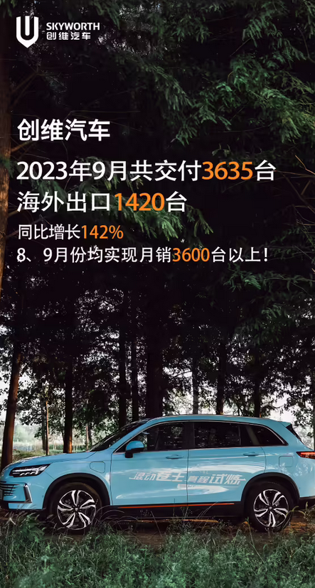 創(chuàng )維汽車(chē) 2023 年 9 月共交付 3635 臺,海外出口 1420 臺,同比增長(cháng) 142%。