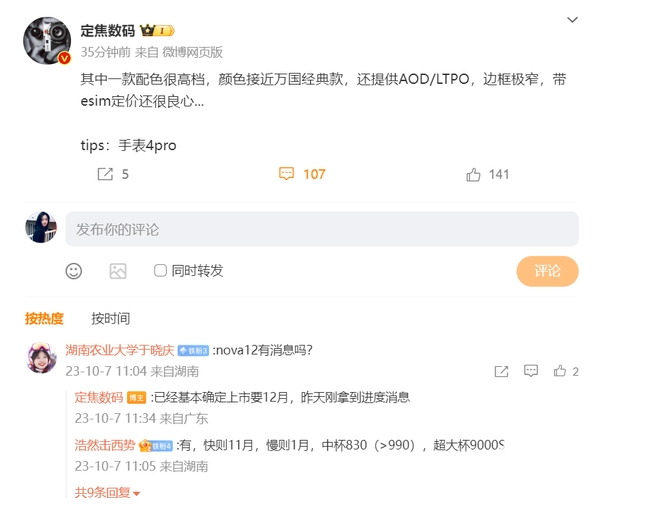 近日,有網(wǎng)友詢(xún)問(wèn)數碼博主“定焦數碼”:華為nova 12有消息嗎?該博主回復道,“已經(jīng)基本確定上市要12月份,昨天剛拿到進(jìn)度消息。”由此來(lái)看,目前華為nova 12系列手機或已基本定型。