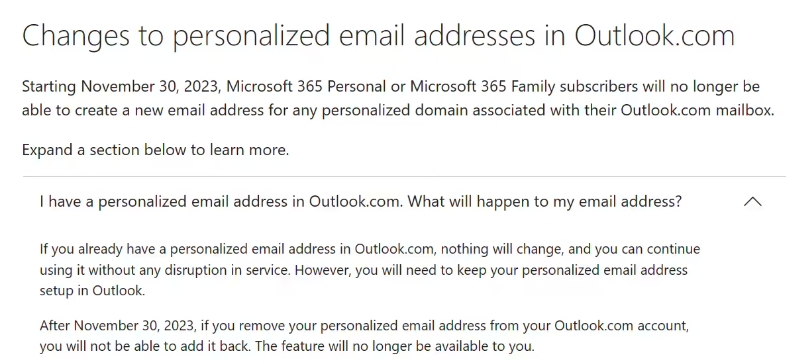 微軟近日更新了旗下 Microsoft 365 訂閱服務(wù)政策,Microsoft 365 個(gè)人版及家庭版訂閱用戶(hù)在 11 月 30 日后,無(wú)法在 Outlook.com 中綁定個(gè)人域名,有相關(guān)需求的小伙伴可以趁早上車(chē)。