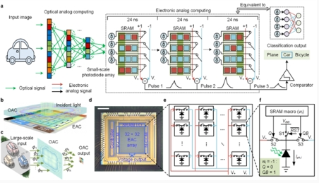 結合基于電磁波空間傳播的光計算,與基于基爾霍夫定律的全模擬電子計算,在一枚芯片上突破了大規模計算單元集成、高效非線(xiàn)性、高速光電接口三個(gè)國際難題。
