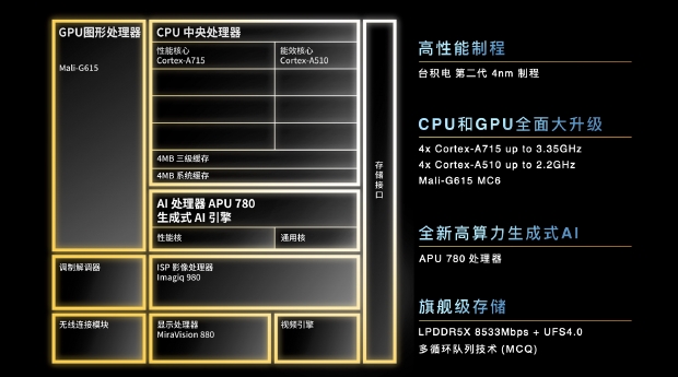 支持旗艦級LPDDR5X 8533Mbps 內存,支持UFS 4.0 閃存以及多循環(huán)隊列技術(shù)(Multi-Circular Queue,MCQ)。內存傳輸速率較上一代提升 33%,閃存讀寫(xiě)速率提升100%。