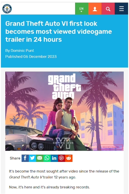 吉尼斯世界紀錄官網(wǎng)當地時(shí)間 6 日發(fā)文宣布,《GTA 6》的首部預告片打破了三項吉尼斯世界紀錄。