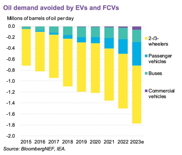 從 2015 年到 2023 年,減少的石油消耗量幾乎增加了兩倍半,從 2015 年每天約 72 萬(wàn)桶增加到 2023 年的近 180 萬(wàn)桶,預計這一趨勢將進(jìn)一步加速。