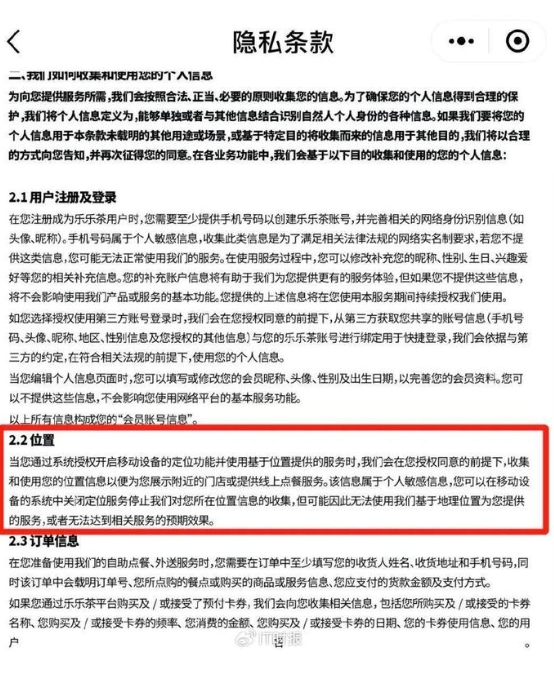 在樂(lè )樂(lè )茶小程序的隱私條款中提及,“會(huì )在授權同意的前提下,收集和使用位置信息以便展示附近門(mén)店或提供線(xiàn)上點(diǎn)餐服務(wù)。如果消費者關(guān)閉定位服務(wù)停止樂(lè )樂(lè )茶對消費者所在位置信息的收集,可能因此無(wú)法使用樂(lè )樂(lè )茶基于地址位置提供的服務(wù),或者無(wú)法達到相關(guān)服務(wù)的預期效果。”