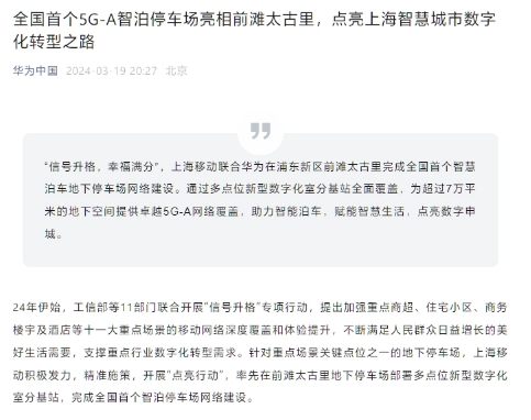 華為、上海移動(dòng)聯(lián)合打造,全國首個(gè) 5G-A 智慧停車(chē)場(chǎng)亮相:可節省超 30 分鐘停取車(chē)時(shí)間 08:58:57