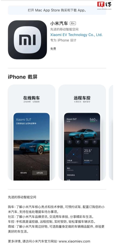 小米汽車(chē) SU7 將于 3 月 28 日晚 7 點(diǎn)正式發(fā)布,目前小米汽車(chē) App 已上架了蘋(píng)果 App Store。