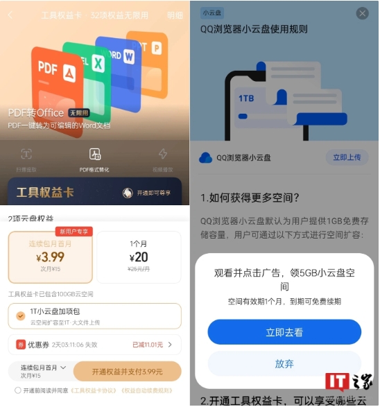 以 QQ 瀏覽器工具權益卡為例,這項權益默認 6 元(連續包月)/10 元每月,而如果附加“1TB 小云盤(pán)加項包”則會(huì )來(lái)到 15/25 元每月,新人用戶(hù)會(huì )贈送一定額度的優(yōu)惠券。