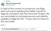 微軟在今日置頂的推特表示,考慮到當前形勢,Edge 團隊將與 Chromium 項目的開(kāi)發(fā)節奏保持一致,暫停將穩定通道更新至 Edge 81。當